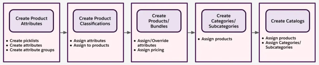 This flow is a bottom-up approach that starts with creating smaller product elements before moving on to the creation of actual products and bundles. The last stages involve defining the product categories and if needed, separate catalogs.
