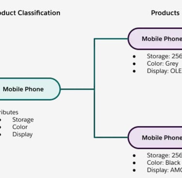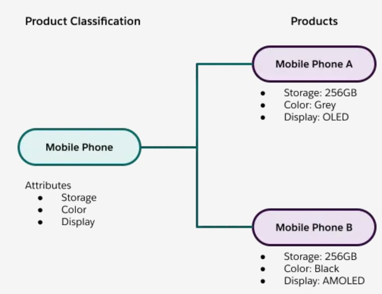 For example, consider Mobile Phone as a Product Classification that defines common attributes such as OS, Storage, Color &Variant. Using this classification, you can create multiple products like iPhone, Google Pixel, and other mobile phone variations without having to define each product from scratch. Each product automatically inherits the attributes and configuration rules from the Mobile Phone classification, ensuring consistency and saving time when managing a large catalog of similar products.