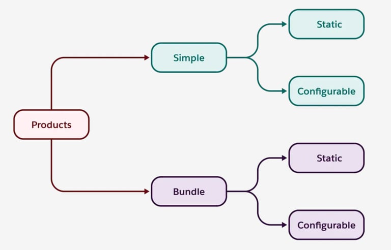 Products are the items or services your company sells to customers, and they can be defined as Simple or Bundled. Simple products are standalone items without a hierarchy, while Bundled products consist of multiple products sold together as a single unit, such as a laptop bundle that includes a laptop, mouse, and monitor. Products can also be Static, sold as-is without customization, or Configurable, allowing adjustments during selection—for example, making the mouse optional in the laptop bundle or specifying the number of USB ports when adding the bundle to a quote.