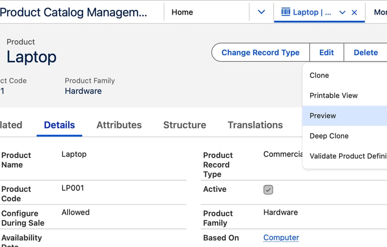 You can use the Preview button on the Product page to view and test the currently assigned Product Configuration Flow for that product. The Preview option launches the configuration experience exactly as it would appear during quoting, allowing you to validate dynamic attributes, options, and constraint behavior before the product is used in live transactions.